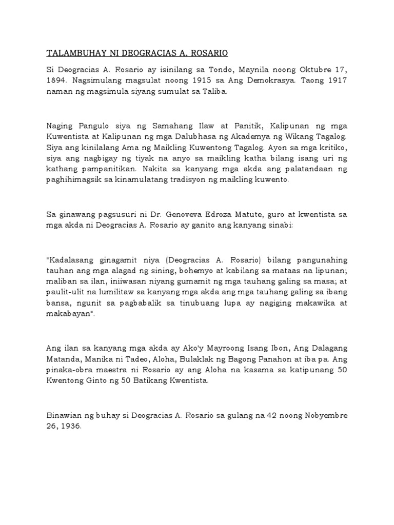 Isinilang sa Tondo Maynila Oktubre 17 1894 Ang Demokrasya 1915 Taliba 1917 Samahang Ilaw at Panitik Kalipunan ng mga Kuwentista Kalipunan ng mga Dalubhasa ng Akademya ng Wikang Tagalog. Rosario Filipino Filipino writer Literatura Literature Maikling Kwento maikling kwento ng pag-ibig Panitikan short stories short story Tagalog tagalog dito Walang Panginoon. Add a bio trivia and more.
